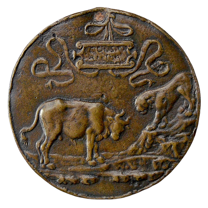 My personal curiosity for the enigmatic “Master IO.F.F.” began with the acquisition of an unsigned Allegory of Constancy, giving birth to my succeeding passion for the study of these challenging objects (fig. 1).1 Unlike the high-drama, multi-figure mythological narratives or the densely populated Livian battle scenes that typically define the work of IO.F.F., this relief presents a stark, emblematic encounter. In the bronze, a bull with its head lowered in a posture of unwavering resilience awaits the descent of a predatory lion from a rocky incline; above them, a cartouche suspended by a ribbon bears the simple epigraphic inscription CONST/ANTIA. As the first plaquette I ever owned, it served as an intellectual puzzle: why would a master die-cutter, renowned for translating complex, university-driven Greek and Roman epics into bronze, produce such a minimalist, stoic motto? The answer to this anomaly lies not in passive artistic preference, but in the volatile socio-political matrix of Renaissance Bologna and the fierce economic realities of its metallurgical trade.