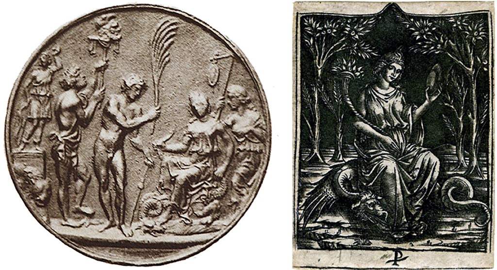 Fig. 5: Bronze plaquette of an Allegory of Prudence or The Apuleian Isis by Giovanni Francesco Furnio, ca. 1500-1506 (above; ex-Gilbert collection); niello print of an Allegory of Prudence by Peregrino da Cesena, ca. 1500 (below; British Museum, inv. 1868,0822.5)