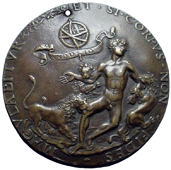 Although possibly not by IO.F.F., a more direct contemporaneous example of this theme is observed in an Allegory of Fidelity depicting a naked youth steadfastly enduring an attack by lions, accompanied by the profound Latin legend: ET SI CORPUS NON FIDES MACULABITUR (“Even if the body is destroyed, faith/fidelity shall not be spotted”) (fig. 14). This inscription provides direct, textual evidence (on the bronze itself) that these weapons were used to project an intellectualized, sacrificial masculinity.56 By carrying a weapon adorned with these specific pommels, the Bolognese patrician bore a defiant martial manifesto, broadcasting their readiness to defend Bolognese libertas against tyrannical encroachment.