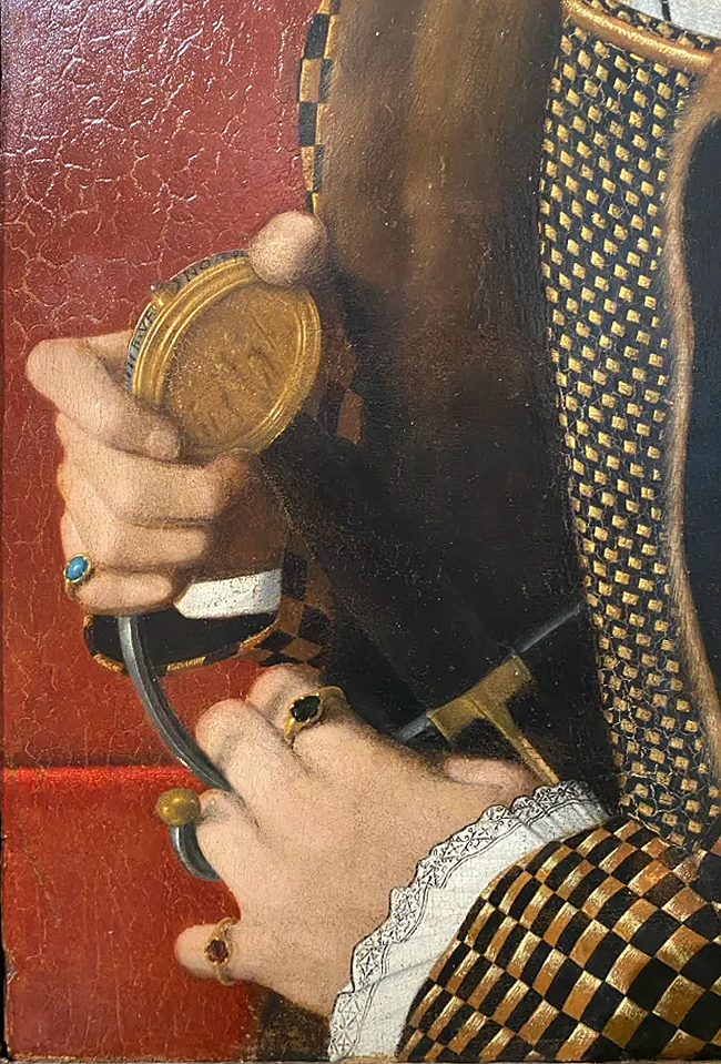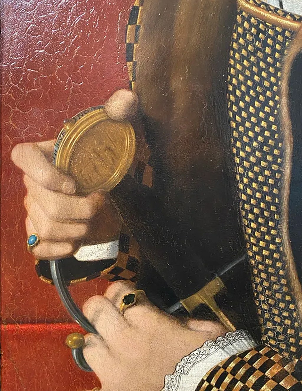 Fig. 9: Amico Friulano del Dosso’s Portrait of a Man, ca. 1515-20, holding a high-value Furnio-Frizzi manufactured sword with a relief plaquette depicting the Sacrifice of Marcus Curtius (private collection)