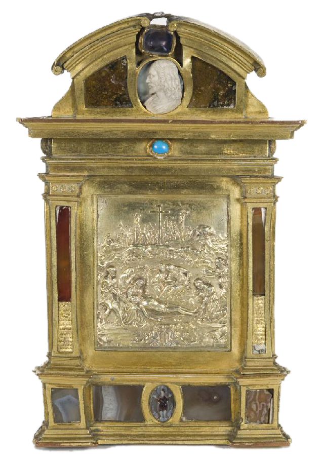 Fig. 3: Silver relief of the Entombment, attributed Giovanni Francesco Furnio, probably 1498, set in a later ca. 1530s-40s gilt silver frame with enamel and hardstone embellishments (Treasury of the Cathedral in Cividale del Friuli, Italy)