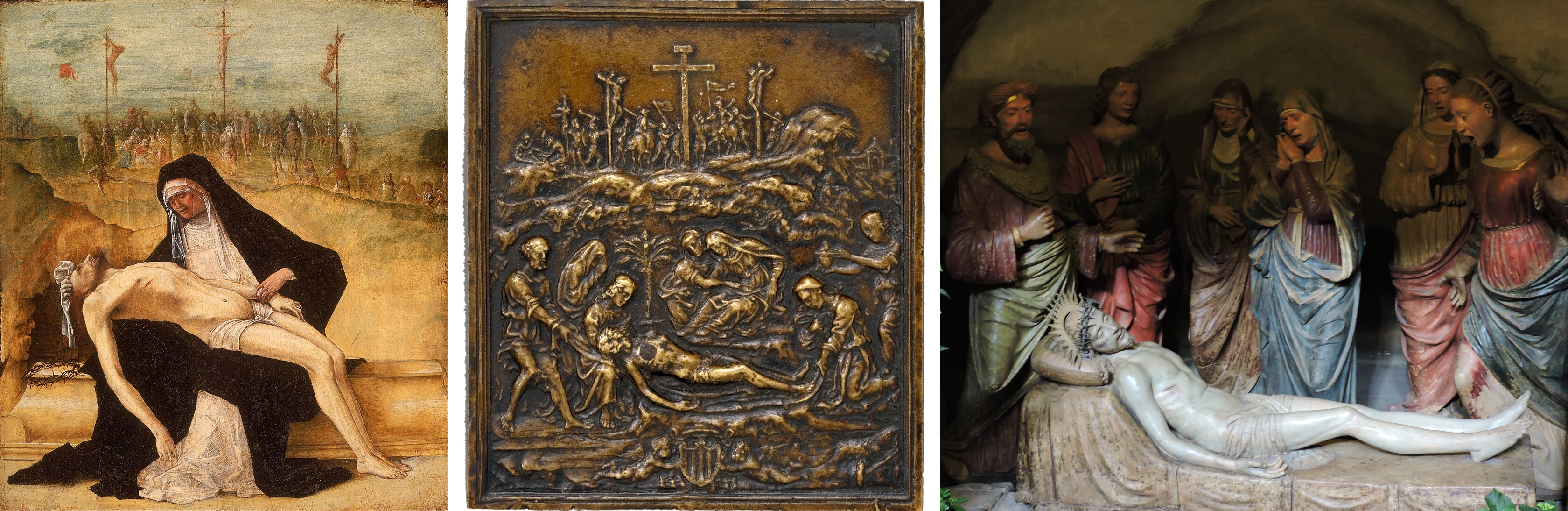 Fig. 4: Central predella panel, oil-on-panel, from the Chiesa di San Giovanni in Monte, Bologna, by Ercole de’ Roberti, ca. 1482-86 (left; National Museums Liverpool, UK); bronze plaquette of the Entombment, attributed Giovanni Francesco Furnio, probably 1498 (after a silver original in fig. 3) (center; Roger Arvid Anderson collection); polychrome terracotta Compianto by Vincenzo Onofri, last years of the 15th century (right; Basilica di San Petronio, Bologna)