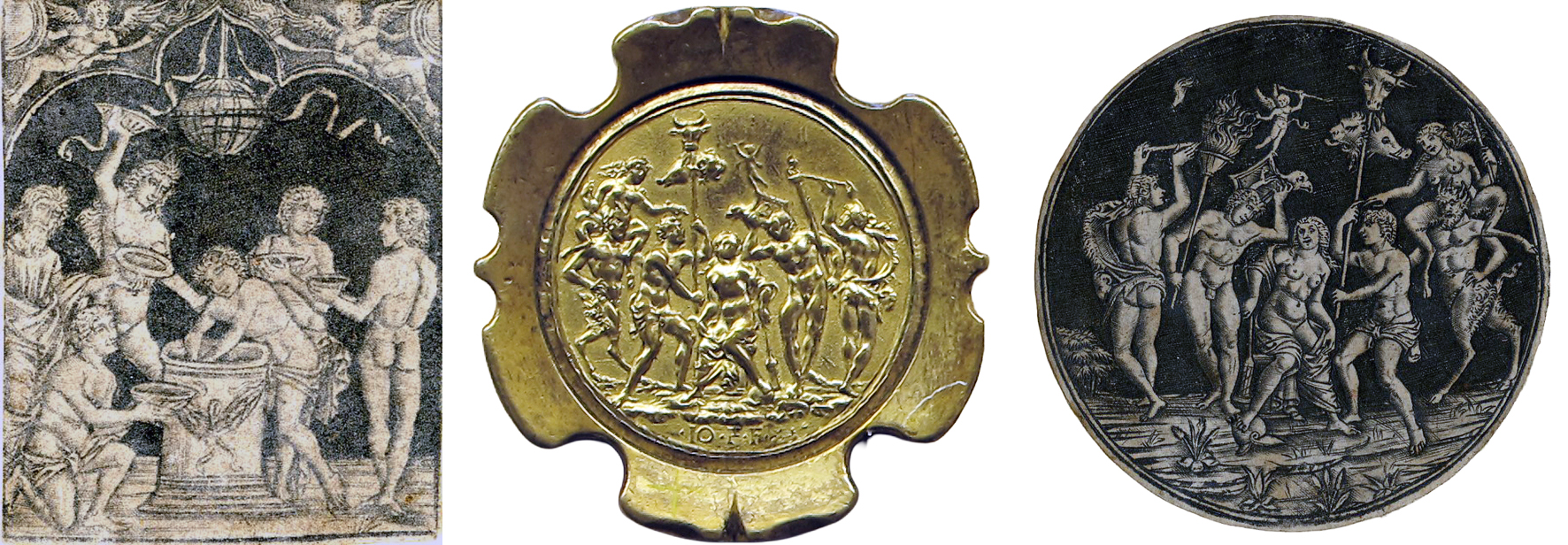 Fig. 6: Niello print of a Bacchanal, ca. 1500 (left; British Museum, inv. 1842,0806.1); gilt bronze plaquette and sword pommel depicting Ariadne on Naxos by Giovanni Francesco Furnio, ca. 1500 (center; Museo Nazionale del Bargello, inv. 1696C); niello print of the same subject, ca. 1500 (right; British Museum, inv. 1868,0822.4)