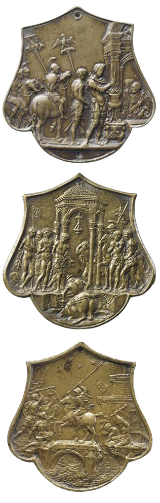 Fig. 11: Bronze plaquettes depicting (from top-to-bottom), the Trial of Mucius Scaevola, the Death of Marcus Curtius, and Horatius Cocles Defending the Bridge by Giovanni Francesco Furnio, ca. 1502-06 (Louvre, invs. OA 2852, OA 9257, and OA 9255)