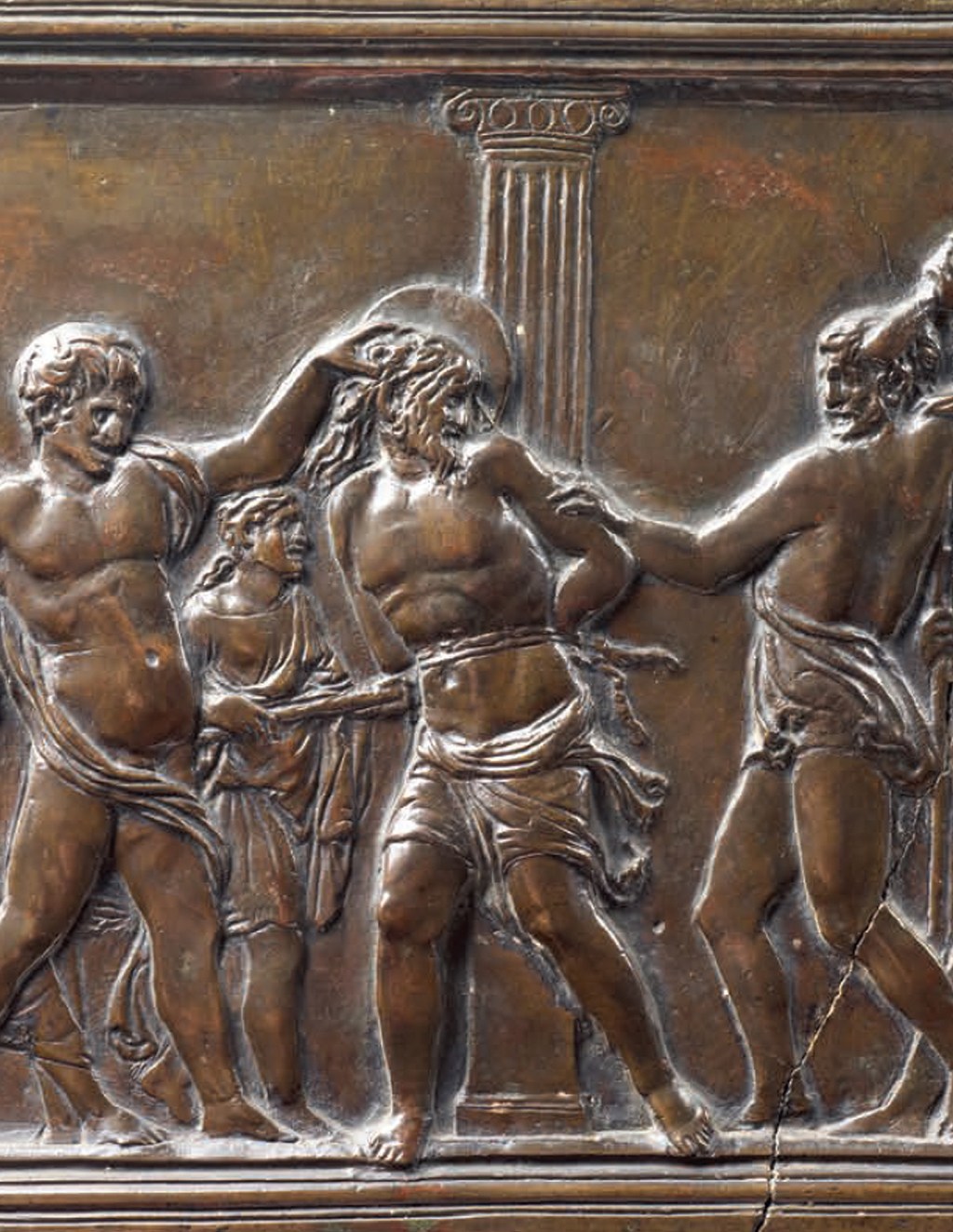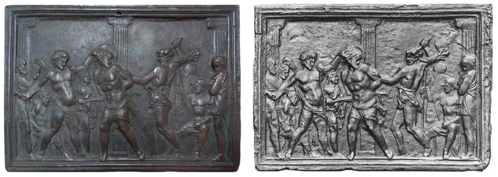 Not noted in previous literature are two additional bronze variants that illustrate the long afterlife of the Flagellation plaquette. The first is a cast preserved in the Budapest Museum of Fine Arts (fig. 3, left), an example apparently overlooked entirely in previous scholarship. This relief presents a subdued image, likely the result of successive aftercasting; however, the presence of intentional chasing—particularly on the column capitals—suggests a workshop attempt to revive the crispness of the original relief. While its provenance remains unknown to the present author, its existence suggests a wider distribution of the relief than was previously known.