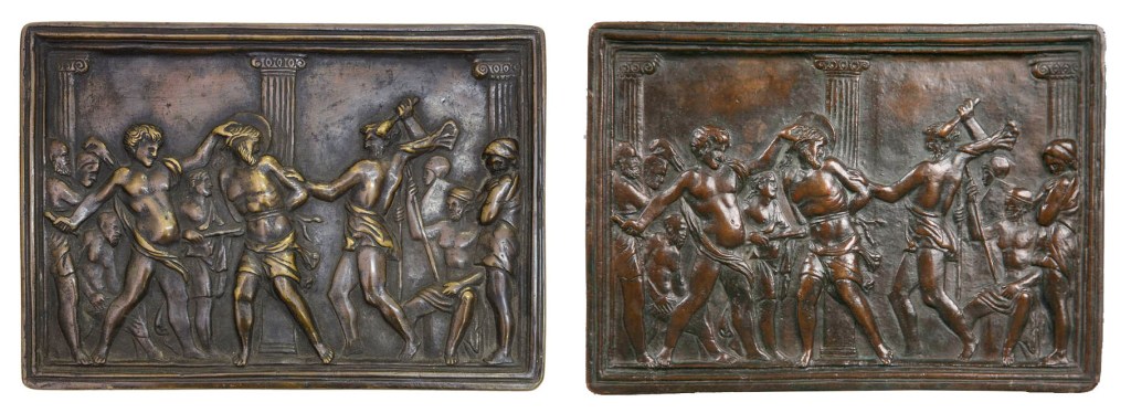 Fig. 3: Bronze plaquettes of the Flagellation of Christ, possibly by Ratko Brajković (?), after models by Giorgio da Sebenico, ca. 1460s (left, Budapest Museum of Fine Arts, inv. 51.899); right, bronze Flagellation of Christ, probably late 19th century cast (art market with Gallarus Fine Arts, NY)