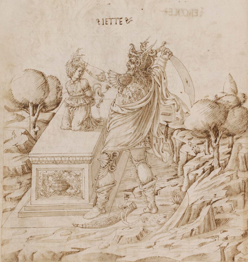 Fig. 7: Detail of a drawing of Jephthah Sacrificing His Daughter on an Altar, 15th century, associated with Maso Finiguerra, from the “Florentine Picture Book Chronicle (British Museum, inv. 1889,0527.32)