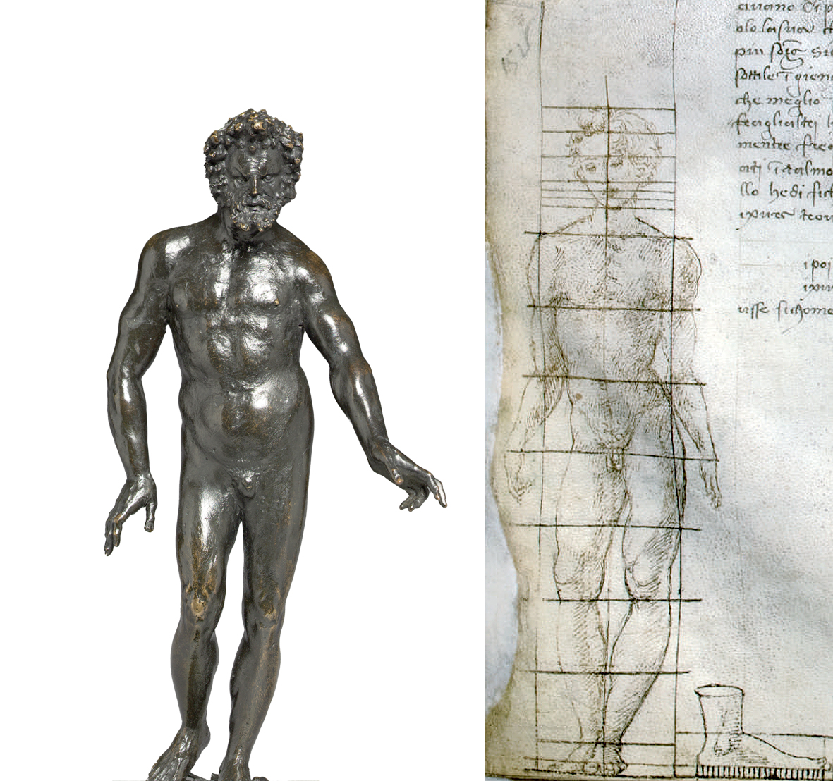 Fig. 3. Standing Figure of a Man (left; Cleveland Museum of Art) and a marginalia detail from Leonardo da Vinci’s copy of Francesco di Giorgio Martini’s Trattato di architettura (right; Codex Ashburnham 361) depicting Martini’s Vitruvian ideal, attributed to an anonymous copyist or follower of Neroccio di Landi, ca. 1480-82.