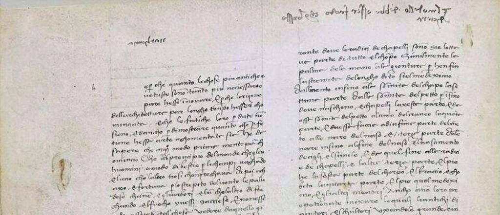 Fig. 4. Codex Ashburnham 361, Folio 15 verso (Biblioteca Medicea Laurenziana, Florence). Detailed view showing Leonardo’s autograph annotations in the upper margins: “anatomia” (left) and “il modello de l’omo si debbe fare di cera” (right)