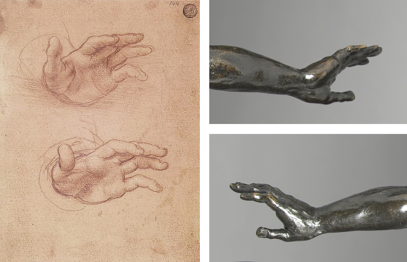 Fig. 5: Left: Cesare da Sesto, Study of Left Hands (Gallerie dell’Accademia, Venice, inv. 140). Right: Detail views of the splayed, rhetorical hands of the Standing Man bronze, acting as conduits for intellectual agency.