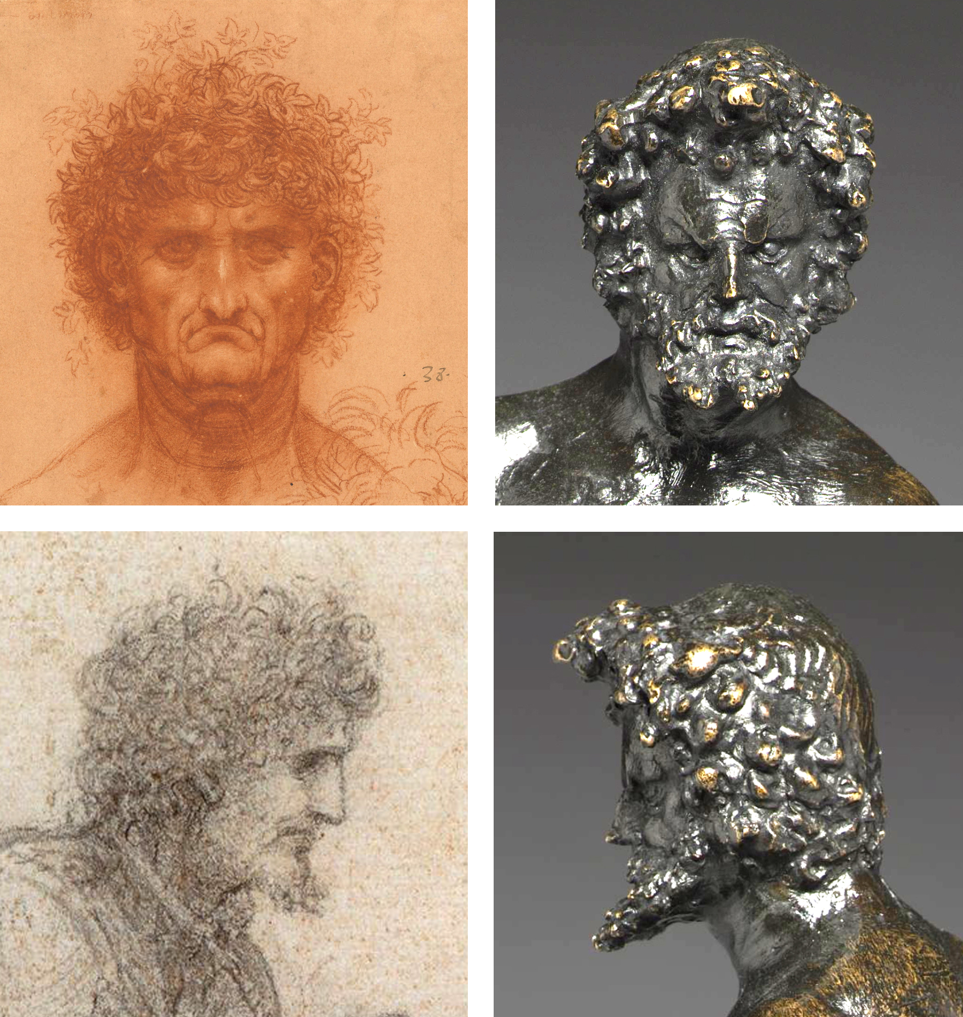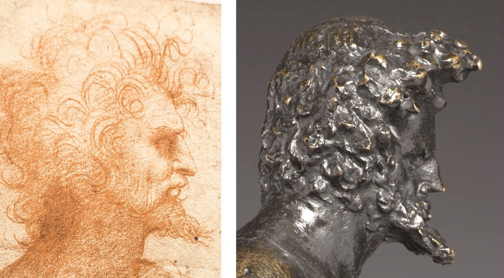 Perhaps the most suggestive evidence for this shared aesthetic milieu is the treatment of the figure’s hair. Departing from the stylized, rhythmic curls typical of the Sienese Quattrocento, the Standing Man displays a burst of unkempt, wiry, and springy hair. This treatment finds a conceptual parallel in several of Leonardo’s own sketches—specifically his studies of “monstrous” or “grotesque” heads—where hair is actively explored as a chaotic, organic extension of the figure’s internal energy (fig. 7).28 Rather than representing a direct, literal translation of a specific two-dimensional sketch, the wiry quality of the beard and the finger-pressed texture of the locks in the bronze reflect a broader Leonardesque ideal: the desire to capture the spontaneous, fluid vitality of a primo pensiero directly within the malleable medium of wax.