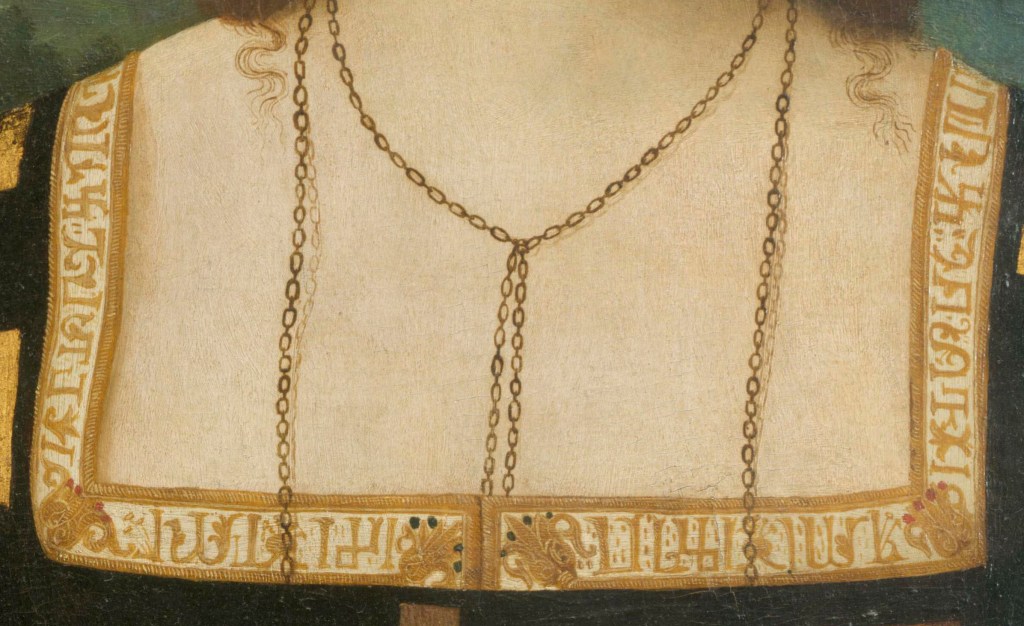 Raphael Sanzio’s Portrait of Elisabetta Gonzaga, Duchess of Urbino, painted around 1504, presents a visual enigma that has long been subdued by conventional art historical classifications.[3] The square neckline of the Duchess’s black velvet gown is framed by a continuous band of golden glyphs.[4] For over a century, scholarly consensus has largely dismissed this intricate border as a ‘pseudo-Kufic’ motif (fig. 2), categorizing it as a generic, Orientalizing decoration of the sort frequently utilized in fourteenth- and fifteenth-century Italian painting to adorn the hems and halos of the Virgin Mary and various saints.[5] This traditional reading, however, strips the garment of its profound historical and psychological agency.