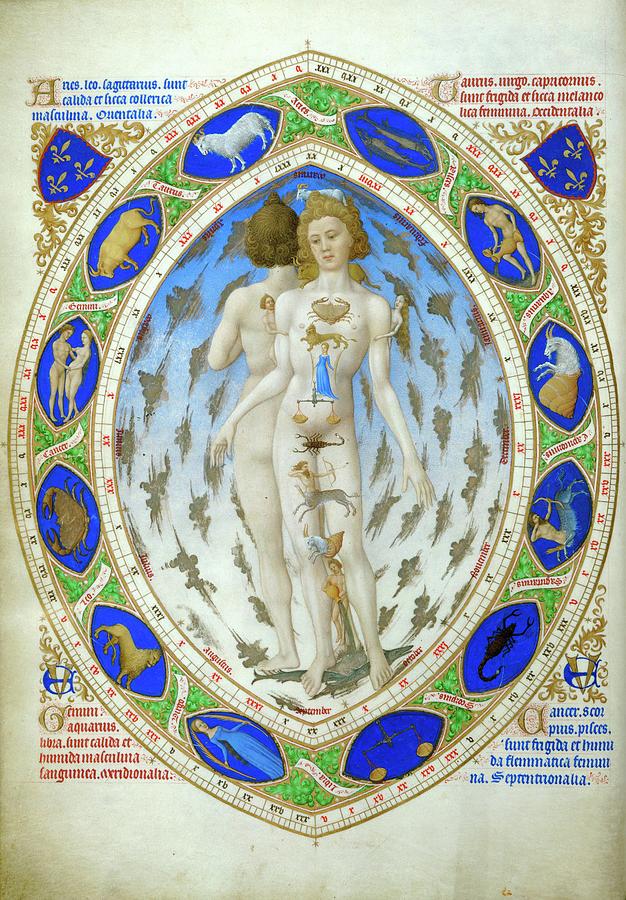 Fig. 5 – Limbourg Brothers, The Anatomical Man (or Zodiac Man), from Les Très Riches Heures du Duc de Berry, ca. 1416. This manuscript illumination illustrates the Hellenistic and Hermetic doctrine of melothesia, assigning control of the Scorpio constellation over the reproductive organs.