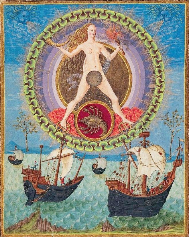 Fig. 6 – Attributed to Cristoforo de Predis, Luna, from Sacrobosco’s De sphaera mundi, ca. 1470 (Biblioteca Estense). The image conflates Luna with Fortuna, standing above a scorpion to illustrate the Moon ruling Scorpio.