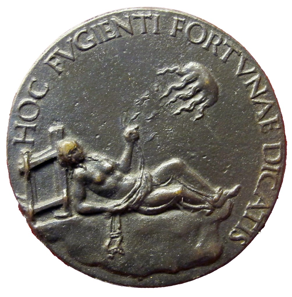 Fig. 7 – Portrait Medallion of Elisabetta Gonzaga (reverse), attributed to Adriano Fiorentino or Gian Cristoforo Romano, ca. 1495–1502 (Museo Nazionale del Bargello). The reverse depicts Danaë and the shower of gold, accompanied by the inscription Hoc Fugienti Fortunae Dicatis.