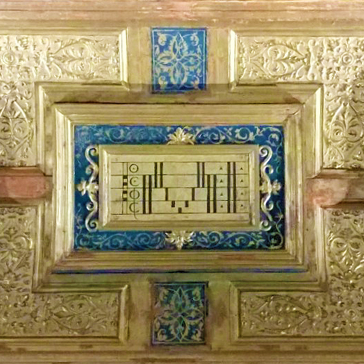 The translation of musical notation into sartorial display was not an abstract concept at the Mantuan court; it was a documented aesthetic strategy actively utilized by the Gonzaga women to project interior virtue. For example, Elisabetta’s earlier noted sister-in-law, Isabella d’Este, established a direct and powerful precedent for this practice by commissioning a gown prominently featuring the “Pause” motif—a vertical rectangular bar derived directly from fifteenth-century mensural notation signifying a musical rest, or silence.[48] Isabella further reinforced this theme in the architecture of her private apartments, where the gilt ceiling of her grotta presented viewers with musical pentagrams populated exclusively by rests and repeat signs (fig. 8).[49] By wearing the notation of silence, the female patron asserted a highly intellectualized control over her own voice and body, turning her garment into a visual manifesto of calculated restraint.