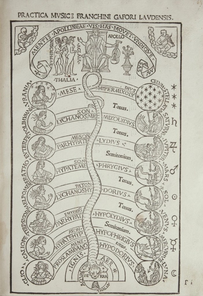The placement of this rhythmic grid over the entirety of the Duchess’s body, is profoundly significant within the context of Renaissance medical magic. As contemporary diagrams illustrate, the healing influence of the planetary spheres was believed to be transmitted downward through strict mathematical and musical ratios overseen by Apollo, the dual god of medicine and music (fig. 10). According to Ficinian theory, the spiritus—the subtle, vaporous channel that unites the physical flesh with the immortal soul and acts as the receptor for celestial influences—is generated by the heat of the heart and diffused via the arteries throughout the body.[53] Because the musical staves encompass her complete physical form, her whole being acts as the continuous ‘performance’ of the score. As Elisabetta breathes, gestures, and navigates the space of the court, the polyphonic grid of the gamurra dynamically shifts and resonates.[54] This total bodily envelopment effectively turns the garment into a living, talismanic matrix that cycles the tactus through her vascular system.[55] While we cannot know if the Duchess intended to ‘play’ her own bodice, the physical expansion and contraction of the five-bar staff during her respiration creates a literal, phenomenological performance of the tactus.[56]