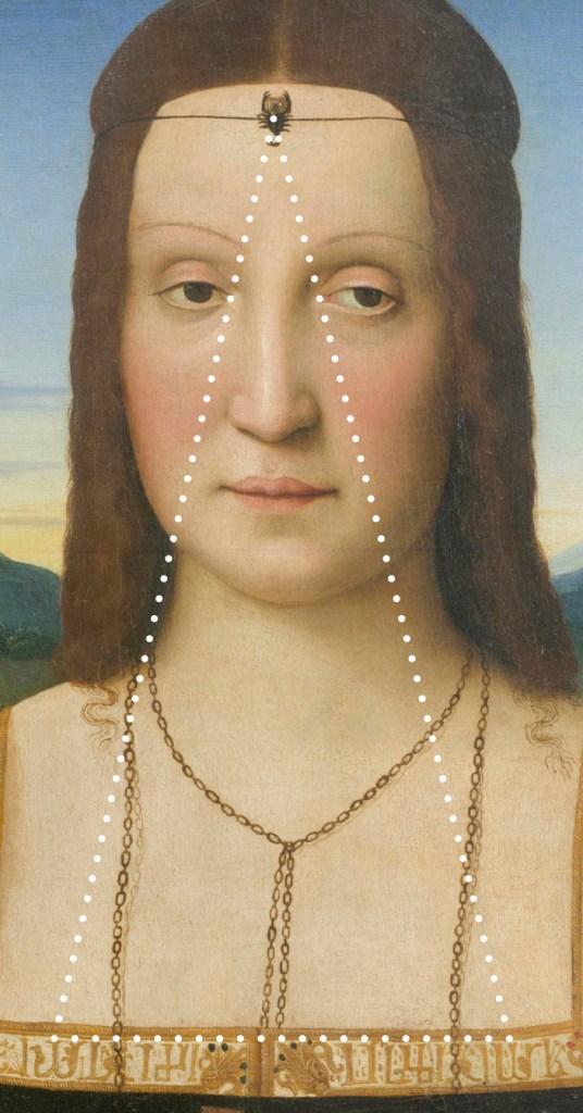 Fig. 12 – An exact Venusian Golden Triangle connects the “fallopian” Omega lunar nodes at the neckline’s base to the scorpion—the astro-medical ruler of fertility—situated at the apex of Elisabetta’s mind.